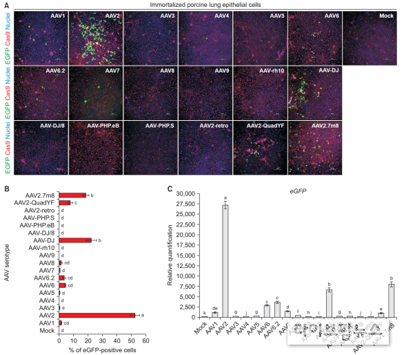 이를 활용해 아데노관련바이러스(AAV) 18종을 대상으로 돼지 폐 세포 내 전달 효율을 비교‧분석한 결과, AAV2 유형이 약 52%로 가장 높았다.