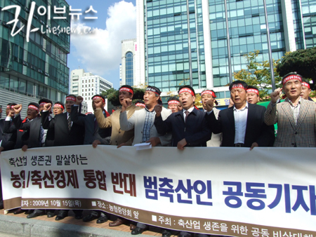 축산업 생존을 위한 공동 비상대책위원회(상임위원장 이승호)는 15일 서울 서대문 농협중앙회 앞에서 축산관련 관계자들이 모인 가운데 농협의 농‧축산경제 통합 방침 반대 기자회견을 개최했다. 비대위는 사업구조개편 과정에서 축산경제부문을 축소내지 폐지하려는 것을 즉각 중단하고 축산발전에 맞게 축산경제 사업과 조직을 확대해 줄 것을 요구했다.