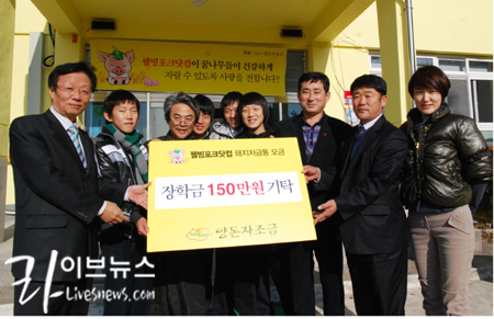 양돈자조금관리위원회(위원장 김동환)는 지난 16일 경남 고성군에 위치한 고성중학교 삼산분교를 찾아 150만원 상당의 장학금을 전달하는 행사를 가졌다. 2008년 인천광역시 대청면 소청분교, 경북 고령군 도진분교, 2009년 충북 청원군 금관분교에 이어 네 번째 장학금 전달이다.