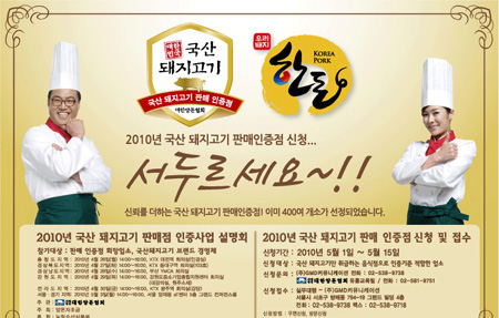 대한양돈협회(회장 이병모)는 5월1일~15일까지 2010년 국산 돼지고기 판매 인증점을 모집한다. 국산 돼지고기 판매 인증점은 현재 약 4백여 개소가 선정되어 운영 중이며 소비자에게 안전한 국산 돼지고기 공급에 앞장서고 있다.