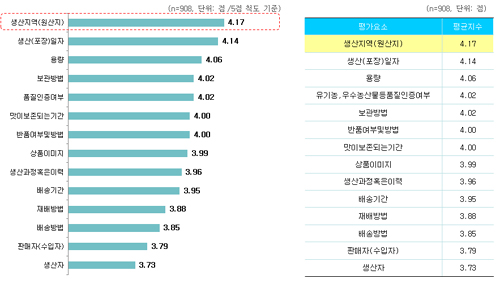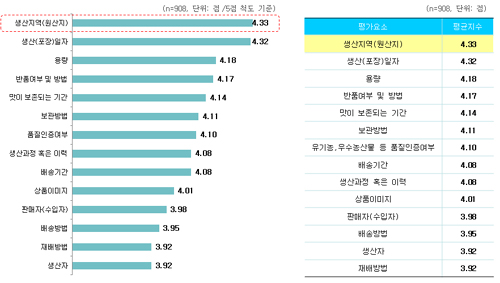 | 한국소비자연맹은 온라인을 통한 농·축·수산물의 구매가 증가함에 따라 온라인농수축산식품의 구매한 경험이 있는 소비자들의 만족도 및 불만사항을 알아보고 온라인 농·축·수산물 구매 시 필요한 정보항목 및 제공하는 정보에 대한 만족도 등을 알아보기 위하여 6월10일부터 30일까지 농식품 구매경험자 900명을 대상으로 온라인 설문 조사를 실시했다. 그 결과 최근 1년간 농·축·수산물의 온라인 구매 경험은 농산물이 가장 많아 전체 응답자의 43.6% 구입 경험이 있으며, “수산물”은 29.4%, “축산물”이 27.9% 순으로 나타났다. 또한 최근 1년간 농·축·수산물을 온라인으로 구매한 횟수는 “농산물”이 평균 8.7회, “축산물” 평균 8.0회, “수산물” 평균 6.4회 구매한 것으로 나타나 농축수산물 중에는 농산물의 구매회수가 많았다. 온라인으로 농축수산물 구입 시 배송편의성에 대한 만족도 가장 높아 온라인으로 구매한 농산물에 대한 만족도에 대해 조사한 결과, 5점 척도 기준으로 “배송”이 3.76점으로 다른 평가요소에 상대적으로 가장 높게 나타났으며, 그 다음으로 “제품의 포장상태”가 3.74점, “가격”이 3.72점 등의 순으로 조사되었다. 축산물의 경우는 배송”과 “제품의 포장상태”가 3.66점으로 다른 평가요소에 상대적으로 높게 나타났으며, 다음으로 “가격”이 3.72점 등의 순으로 조사되었다. 수산물에 대한 만족도에 대해서는 “배송”이 3.68점으로 다른 평가요소에 상대적으로 가장 높게 나타났으며, 그 다음으로 “제품의 포장상태” 3.65점, “가격”이 3.61점 등의 순이었다. 이를 보면 소비자들이 온라인으로 농축수산물을 구입시 배송이 잘 된다는 점과 포장상태나 가격면에서 오프라인과 경쟁력이 있다는 점을 알 수 있다. 온라인 구입 농축수산물 오프라인 구입 상품과 품질 비슷하다고 생각 온라인으로 구매한 농축수산물의 품질(신선도 등)이 오프라인에서 구매한 물품과의 차이 정도에 대해 조사한 결과, 전체 응답자의 65.4%가 “비슷하다”고 하였고 “품질이 나쁜 편이다”가 16.4%, “품질이 나은 편이다” 15.6% 로 나타나 소비자들이 온라인으로 구입하는 농축수산물에 대해 품질 수준이 오프라인에서 구입하는 농축수산물과 크게 다르지 않은 것으로 평가하고 있음을 알 수 있다.(품질평균지수 - 5점 척도 기준에서 3.0점 ) 온라인에서 구입하는 농축수산물의 품질에 대해서는 남성보다 여성이, 연령이 높을수록 긍정적인 평가를 하는 경향을 보이고 있었다. 온라인으로 농·축·수산물 구매 시 불편하게 느끼는 사항에 대해 조사한 결과, “사이트와 달리 질이 낮거나 크기가 다른 경우가 있다”는 점에 대해 가장 높게 응답하였으며( 32.9%), 다음으로 “신선도 등 품질이 떨어지는 경우가 있다”가 22.0%, “사이트에 제공되는 정보가 충분하지 않아 선택이 어렵다” 15.6% 순이었다. 온라인으로 농·축·수산물 구매의 장점으로는, 전체 응답자의 37.6%가 “집에서 편하게 배송 받을 수 있어서”를 들어 만족도에서도 보았듯이 배송의 편의성이 온라인 거래의 가장 중요한 장점이 되고 있다. 그 다음으로 “구매하러 다니는 시간이 절약되어서”가 28.4%, “가격이 싸서” 20.7% 순이었다. 온라인 구입 시 생산지역과 신선도를 알 수 있는 정보 중요하게 생각 농·축·수산물 온라인 구매 시 제공되는 제품 정보가 구매 결정 시 어느정도 도움을 주는지에 대해 조사한 결과, 5점 척도 기준으로 “생산지역(원산지)”가 4.17점으로 다른 평가요소에 상대적으로 가장 높게 나타났으며, 그 다음으로 “생산(포장)일자”가 4.14점, “용량”이 4.06점 등의 순이다. |