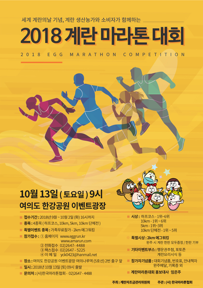 계란자조금관리위원회(위원장 남기훈)는 오는 13일 오전 9시부터 서울 여의도 한강공원 이벤트 광장에서 ‘2018 계란마라톤대회’를 개최한다고 1일 밝혔다.
