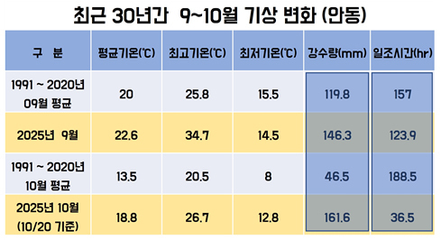 기상청 자료를 바탕으로 한 가을 기상 분석에 따르면, 올해 9~10월은 최근 30년(1991~2020) 평균보다 2~5°C 높은 평균기온, 강수량은 2배 이상, 일조시간은 1/4 수준으로 감소하는 등 극단적인 이상기상이 관측됐다.