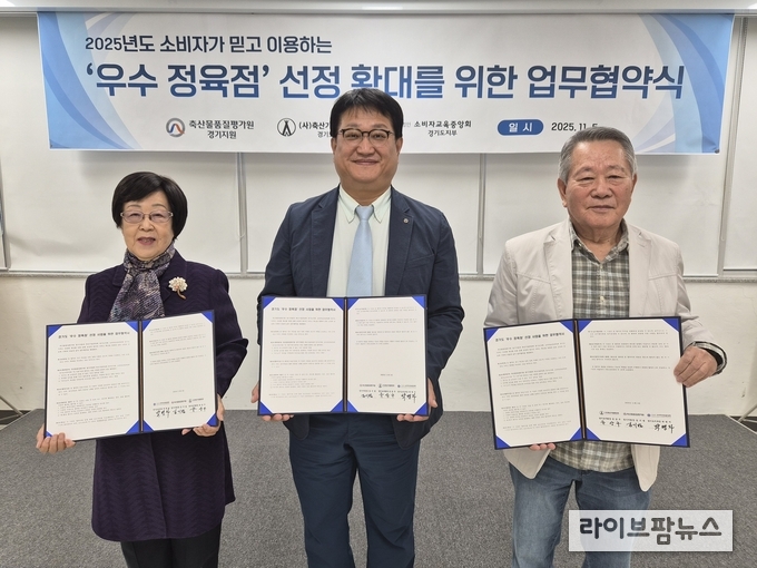 축산물품질평가원 경기지원(지원장 김기범)은 5일 축산기업중앙회 경기도지회·소비자교육중앙회 경기도지부와 함께 소비자가 믿고 이용할 수 있는 ‘우수 정육점’ 선정·확대를 위한 업무협약(MOU)를 체결했다고 밝혔다.
