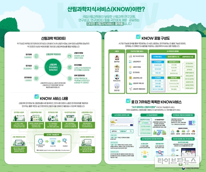 산림청 국립산림과학원(원장 김용관)은 AI 시대의 ‘열린 산림과학’ 구현을 위해 원천데이터를 개방하고, 국민 누구나 손쉽게 활용할 수 있도록 AI 지능형 산림과학지식서비스를 시작한다고 1일 밝혔다.