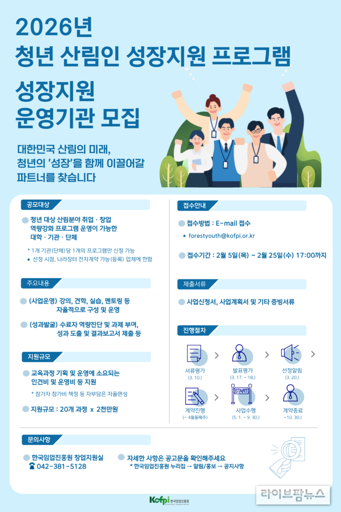 산림청 산하 공공기관인 한국임업진흥원(원장 최무열)은 5일부터 25일까지 산림분야 청년들의 취업과 창업역량을 강화하기 위한 ‘2026년 청년 산림인 성장지원 프로그램’ 운영기관을 모집한다.