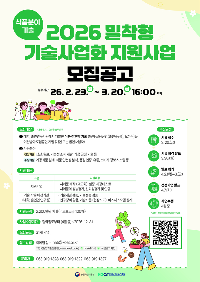 한국농업기술진흥원(원장 안호근, 이하 농진원)은 23일부터 3월 20일까지 대학 및 연구 기관의 식품 관련 기술을 이전받은 기업을 대상으로 2026년 ‘밀착형 기술사업화 지원사업’ 참여기업을 모집한다.