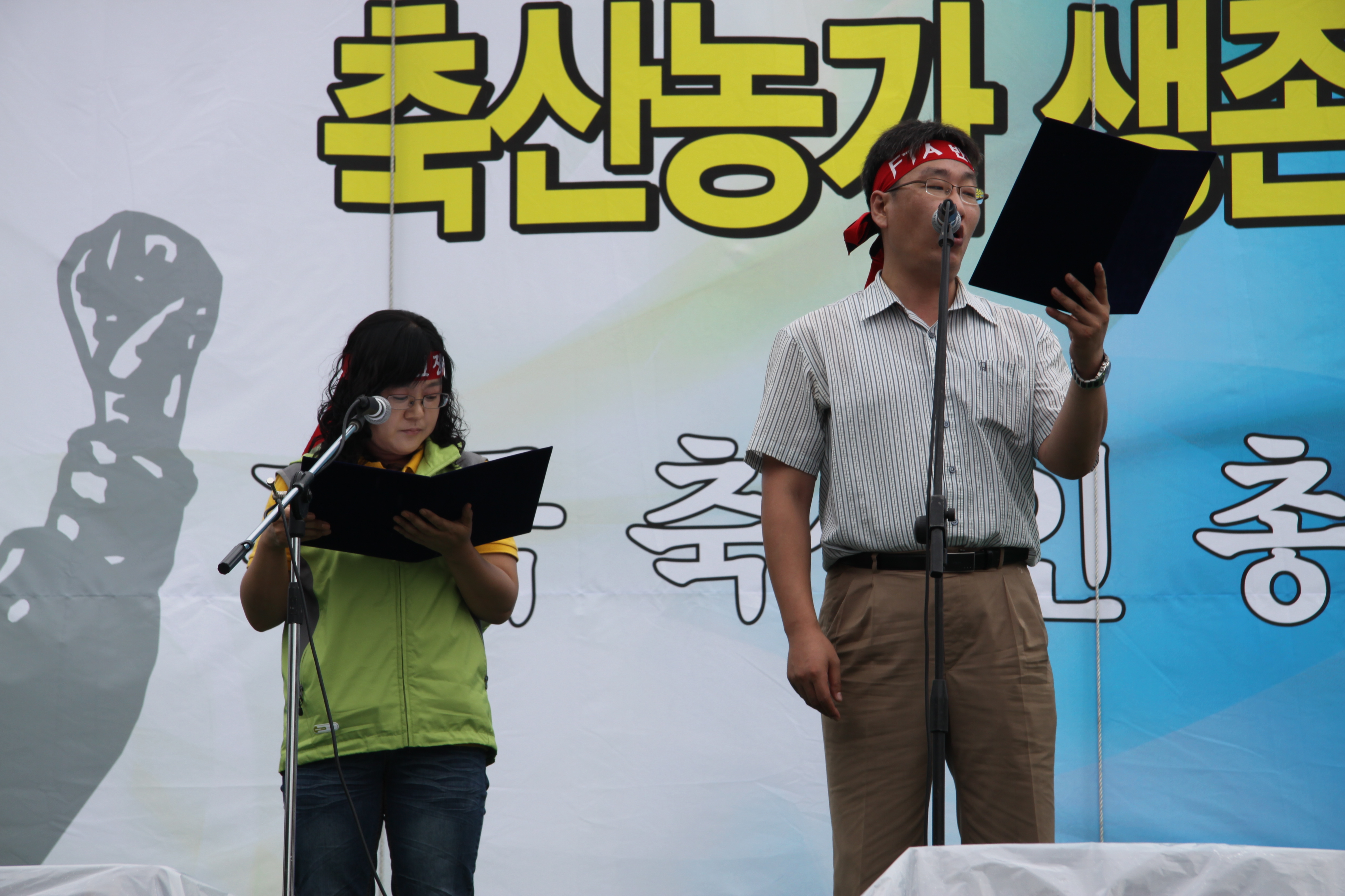 축산농가들은 지난 12일 서울 여의도 공원에서 개최된 ‘FTA 반대! 생존권 쟁취! 전국 축산인 총궐기대회’에서 축산업 지속을 위한 ▲선 대책 없는 FTA 결사반대 ▲축산농가 생존대책 즉각 수립 ▲축산업 규제하는 축산업 선진화 대책 반대 ▲FMD·AI 피해보상금 조속 지급 등을 요구하는 결의문을 국회에 전달했다. 축산농가들은 어려운 여건 속에서도 국민들에게 안전하고 신선한 축산물 공급에 노력하고 있지만, 정부에서는 축산강국과의 FTA로 축산농가를 나락에 빠뜨리고 있다고 지적했다. 또한, 4대강 사업에는 막대한 예산을 투입하면서, FMD‧AI 보상금 지급에는 늦장 대처하고 있다며 정부의 축산정책에 불만을 나타냈다. |