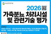 축산환경관리원(원장 문홍길)은 3월 27일부터 5월 26일까지 ‘2026년 가축분뇨 처리시설 및 관련기술 평가 계획’을 공고하고, 신청접수는 4월 27일부터 진행한다. 이번 평가는 서류, 현장, 발표 및 종합평가 순으로 진행되며 기업 역량, 기술 우수성 및 경제성 등을 종합적으로 평가할 계획이다. 종합점수가 70점 이상인 업체의 기술정보는 축산환경관리원 누리집을 통해 정보를 공개하며, 책자로 인쇄되어 지자체, 생산자 단체 및 축산업 종사자 등에게 배포될 예정이다. 평가대상은 ‘공동 및 개별규모 가축분뇨 처리시설’과 ‘가축분뇨 처리기술’, ‘악취저감 및 제어기술’ 및 ‘악취측정 ICT 기계·장비’ 관련기술이다. 이번 평가에서 악취측정 ICT 기계·장비 평가는 기존 평가 대비 측정데이터 신뢰성 및 안정성 확보, ICT 측정장비 내구성 확보, 경제성 등이 평가될 수 있도록 평가 항목을 개정하여 평가 배점을 조정했다. 신청 접수기간은 4월 27일(월)부터 5월 26일(화) 24시까지이며 신청서는 축산환경e로움에 업로드하거나 담당자 이메일을 통해 제출할 수 있다. 또한, 신청서 작성 및 평가 방법 등에 대한 이해를 돕기 위해 4월 23일(목) 14시, 축산환경관리원