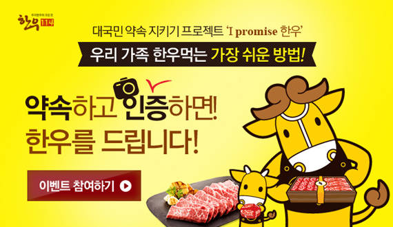 이벤트 참여방법은 한우114 진행중인 이벤트 페이지에 들어가 도전하거나 실천하고 싶은 이야기를 한우 약속카드에 작성 후 실천했다는 인증샷을 올리면 된다. 매월 추첨을 통해 총 5명에게 5만원 상당의 우리한우 정육세트를 상품으로 제공해 준다.