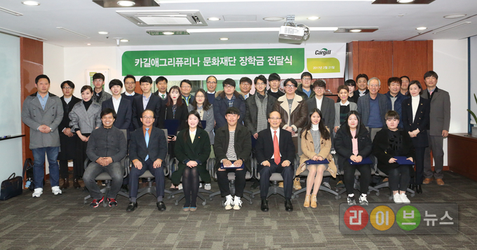 재단법인 카길애그리퓨리나 문화재단(이사장 이보균, ㈜카길애그리퓨리나 대표이사)은 21일, 경기도 성남시 카길애그리퓨리나 본사에서 ‘2017 장학금 전달식’을 개최하고 장학생 38명에게 총 1억원을 수여했다.