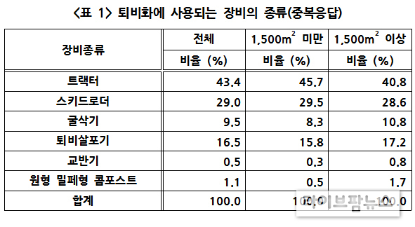 퇴비화에 주로 사용되는 장비로는, 트랙터(43.4%), 스키드로더 (29.0%), 퇴비살포기(16.5%), 굴삭기(9.5%) 순으로 나타났다. 그러나 교반기와 원형 밀폐형 콤포스트 등, 부숙을 위해 직접적으로 필요한 장비를 보유한 농가는 1.6%에 불과했다<표 1>.