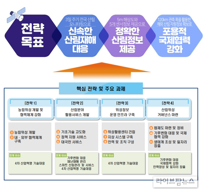 이에 따라, 산림위성 개발 및 운영 기본계획은 ‘더 넓고 신속ㆍ정확한 원격탐사 기반 스마트 산림ㆍ임업 실현’이라는 비전으로 ▲‘신속한 산림재해 대응’ ▲‘정확한 산림정보 제공’ ▲‘포용적 국제협력 강화’라는 3대 전략목표와 4대 핵심 전략, 11개 세부 추진과제로 구성됐다.