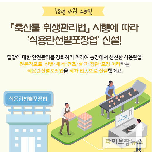 농림축산식품부(장관 김현수)와 식품의약품안전처(처장 이의경)는 가정용 달걀에 대해 의무적으로 식용란선별포장장에서 위생처리를 거치토록 한 선별포장 유통제도가 25일부터 본격 시행됨에 따라 일반 소비자가 더욱 안심하고 달걀을 구입할 수 있게 됐다고 밝혔다.