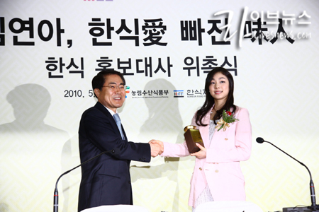 농림수산식품부는 5월 12일 일산 킨텍스에서 열리는 ‘2010 서울국제식품산업대전’내 한식홍보관에서 피겨스케이트 선수 김연아를 한식홍보대사로 위촉했다고 밝혔다.