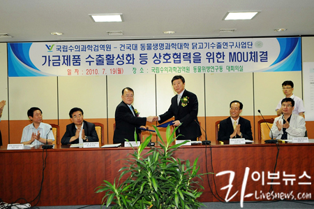 국립수의과학검역원(원장 이주호)은 19일 가금제품 등 수출 활성화를 위해 검역원 동물위생연구동 대회의실에서 건국대 동물생명과학대학(학장 이치호) 및 닭고기수출사업연구단(단장 강창원)과 상호협력에 관한 업무협약(MOU)을 체결했다.