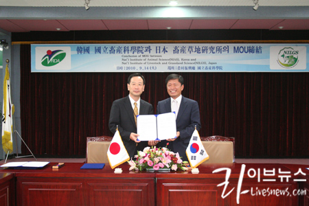 농촌진흥청(청장 민승규)에서는 국립축산과학원과 일본축산초지연구소간의 연구 교류 활성화를 위한 MOU 조인식을 14일 양기관의 대표가 참석한 가운데 체결했다.