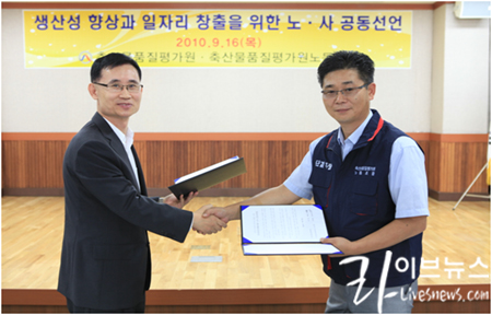 최형규 원장은 25일 130개 공공기관장이 참석한 가운데 중앙공무원교육원에서 열린 2011년 공공기관선진화 워크숍에서 “함께 만드는 미래, 단체협약서 개정”이란 주제로 노사관계선진화 우수사례를 발표했다. 지난 2009년부터 노사 공동으로 노사발전위원회를 구성하여 법과 원칙에 입각한 노무관리와 건전한 노조 활동은 최대한 지원하는 분위기를 정착시켜온 결과 노동부로부터 “노사상생 양보교섭 실천기업”, “작업장 혁신 우수기업” 인증과 “공공부문 노사관계 선진화 우수기관” 표창을 수상하여, 이번 공공기관 선진화 워크숍에서 노사관계선진화 우수사례로 선정되어 발표하게 된 것이다. 노사관계선진화 주요 내용은 노조 측의 인사·경영권 침해조항, 임금 및 근로조건 변경 시 노조 합의조항 등을 단체협약서에서 삭제하였고, 생산성 향상과 일자리 창출을 위한 노·사 공동선언으로 경영선진화 계획을 차질 없이 이행하면서 인력 감축에 따른 문제점을 생산성 향상을 통해 극복했다. 또한, 축산물품질평가원 노사는 ‘마음나눔 2010’이라는 캐치프레이즈 하에 전 직원의 자발적 임금반납으로 조성한 사회공헌기금을 지역사회 불우시설에 지원하고 있으며, 이와 별도로 직원 1인당 평균 1.3매의 헌혈증을 기증한바 있다. 축산물품질평가원 최형규 원장은 “여기에 안주하지 않고 정부의 공공기관 선진화 정책에 한발 더 앞서 나갈 수 있도록 최선을 다하겠으며, 앞으로도 공공기관 임직원으로서 사회적 책임을 다하고, 나눔의 정신으로 사회와 소통할 것”이라고 밝혔다. |