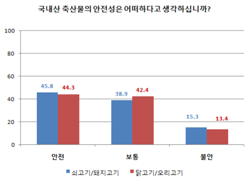 구제역, AI 발생 전과 비교하여 "외식 시 육류메뉴 선택 횟수가 줄어들었다"는 응답자는 47.4%로 국내산 축산물 구입횟수 감소(42%)보다 그 폭이 더 크게 나타났다. 육류 외식이 줄었다는 응답자는 축산물 구입 시 안전성과 원산지를 최우선으로 고려하는 40대 전업주부의 비율이 상대적으로 높았다.