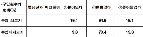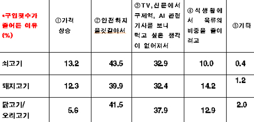 구입횟수가 줄어든 이유로는 "수입육도 안전하지 않을 것 같아서"가 쇠고기 49.1%, 돼지고기47.7%로 가장 높았다.