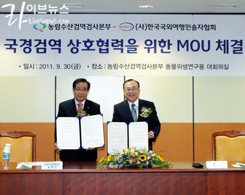 농림수산검역검사본부(본부장 박용호)는 30일 (사)한국국외여행인솔자협회(협회장 송동근)와 국경검역 상호협력을 위한 업무협약(MOU)을 체결했다.