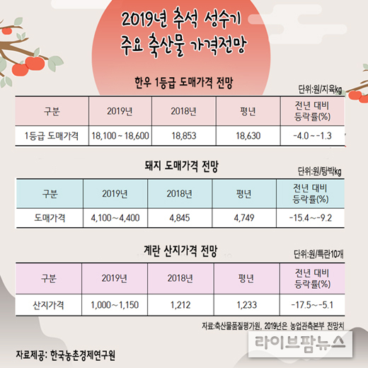2일 한국농촌경제연구원(KREI)은 ‘농정포커스’에 ‘2019년 추석 성수기 주요 농축산물의 출하 및 가격전망’을 발표하고 한우와 돼지, 계란 등 주요축산물 가격은 생산량 증가로 전년보다 다소 하락할 것으로 전망했다.
