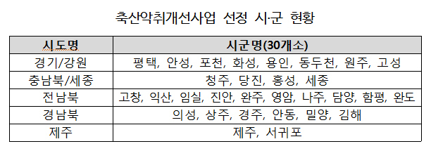농식품부는 금번 공모에 참여한 76개 시군을 대상으로 지역별 악취개선계획의 타당성과 실행 가능성, 악취개선의 시급성, 지자체 및 농가의 악취 개선의지 등에 대해 시도 및 전문가 평가를 거쳐서 30개 시군을 선정했다.