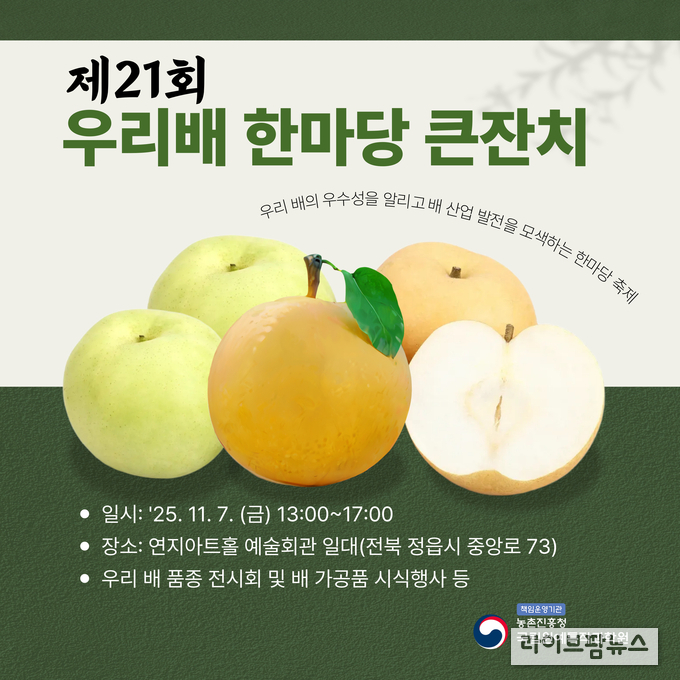우리 배 품종의 매력을 알리고 산업 재도약을 다짐하는 자리가 마련된다. 농촌진흥청(청장 이승돈)은 11월 7일 전북특별자치도 정읍시 연지아트홀 일대에서 ‘제21회 전국 우리배 한마당 큰잔치’를 연다.