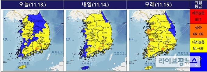 또한 최근 10년간 가을철 평균습도 분석 결과, 평균습도가 30~50%일 때 일평균 3.2건의 산불이 발생했다. 실제로, 금년 가을철 산불조심기간 중 6건의 산불이 발생했던 지난 11월 10일의 전국 평균습도는 45%로 분석됐다.