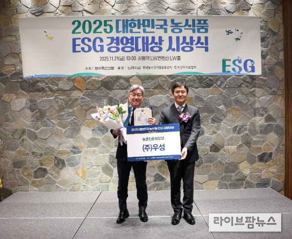 ㈜우성(대표이사 한재규)은 지난 21일, 농림축산식품부와 농촌진흥청이 후원하고 농수축산신문이 주최·주관한 ‘2025 대한민국 농식품 ESG 경영대상’에서 최우수상(농촌진흥청장상)을 수상했다고 밝혔다. 이번 수상은 우성이 축산·식품·환경 분야에서 지속가능경영을 추진하며 ESG 중심의 혁신을 이어온 노력이 높게 평가된 결과다.