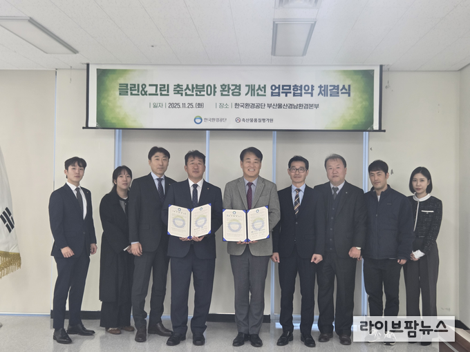 축산물품질평가원 부산울산경남지원(지원장 김학성)은 11월 25일, 한국환경공단 부산울산경남환경본부(본부장 서승명)와 부산울산경남환경본부 대회의실에서 ‘친환경·저탄소 축산환경 조성을 위한 업무협약(MOU)’을 체결했다고 밝혔다.