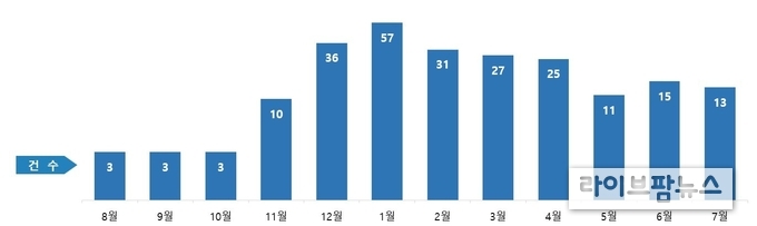 최근 5년(’20~’24)간 노로바이러스 식중독은 총 234건이 발생했으며, 월별 발생추이 분석 결과 12월부터 이듬해 2월까지 발생한 식중독 건수는 124건으로 전체 식중독 건수의 약 53%가 겨울철에 발생한 것으로 나타났다.
