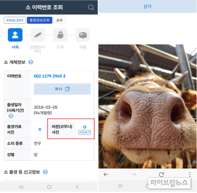 소의 코 무늬인 ‘비문’은 소의 개체식별 정확도를 획기적으로 높이는 정보로, 이번 서비스를 통해 비문 정보가 등록된 일부 개체는 우선 조회가 가능하다. ‘축산물 이력정보 앱’을 실행해 개체식별 번호를 조회하면 소 비문 사진을 ‘원터치’로 즉시 확인할 수 있다. 소 개체식별 번호 조회 시 이력 정보와 함께 해당 소의 비문 사진을 한 번에 볼 수 있게 된 셈이다.