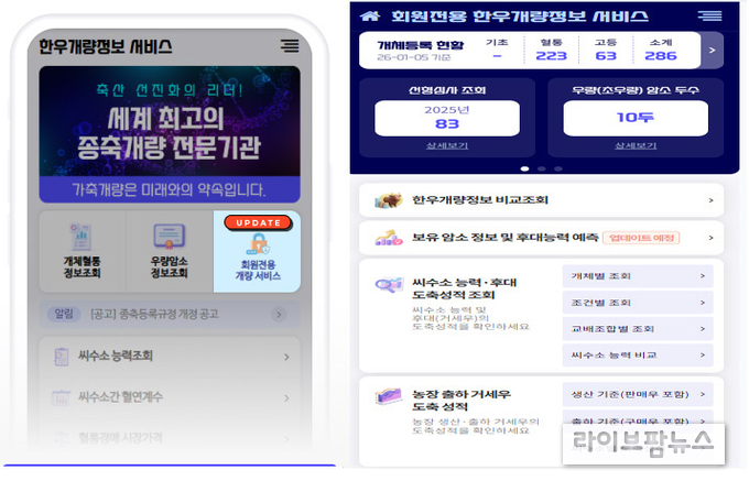 한국종축개량협회(회장 이재윤)는 한우개량정보 앱의 ‘회원 전용 개량 서비스 고도화’를 올해 3월 완료를 목표로 추진하고 있으며, 이에 앞서 우선 개발된 메뉴를 5일부터 제공할 예정이라고 밝혔다.