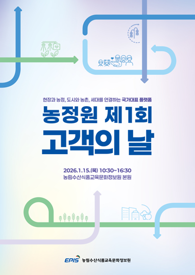 농림수산식품교육문화정보원(원장 윤동진)은 오는 15일 오전 10시 30분, 본원에서 ‘농정원 제1회 고객의 날’ 행사를 개최한다고 밝혔다.