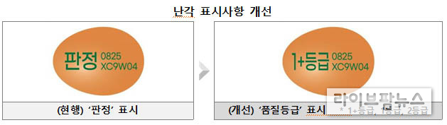 이번에 바뀐 제도에 따라 “등급판정을 받은 후 포장하는 공정”을 갖춘 업체에 한하여 계란 껍데기에 품질등급(1+·1·2 등급)을 표시할 수 있도록 했으며, 이와 달리 포장 후 등급판정을 받는 업체는 기존과 같이 계란껍데기에 “판정” 표시만 할 수 있다.