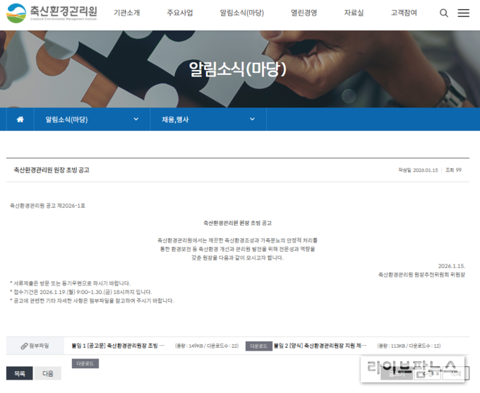 축산환경관리원 원장추천위원회는 4대 축산환경관리원장 초빙을 위해 15일부터 30일까지 후보자를 공개 모집하고, 1월 19일부터 응시서류를 접수한다고 밝혔다.