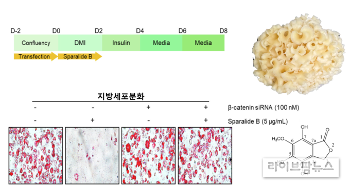국립산림과학원은 국립경국대학교와의 공동 연구를 통해 꽃송이버섯에서 분리한 프탈라이드(phthalide) 계열 화합물 ‘스파랄라이드 B(Sparalide B)’가 지방전구세포의 분화를 억제하고 지방 축적을 감소시키는 분자기전을 밝혀냈다.