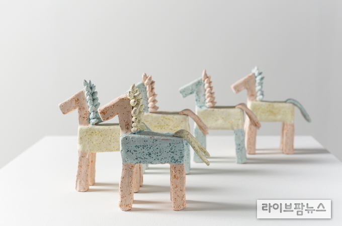 작가에게 특별한 존재였던 말은 ‘금별’이다. 흰 바탕에 갈색 얼룩무늬가 별처럼 보여 붙여진 이름으로, 조랑말과 서러브레드를 교배한 한라마 품종이다. 온순하고 노련했던 ‘금별’은 작가에게 따뜻한 위로를 건네던 존재로 기억된다. 이번 전시에는 ‘금별’의 모습을 담은 도자 작품 약 20점이 소개된다.