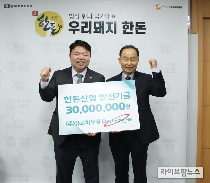 유로하우징(대표 신일식)은 18일 대한한돈협회(회장 이기홍)를 방문해 한돈산업 발전을 위한 기금 3천만원을 기탁했다. 이번 기금 전달식에는 대한한돈협회 이기홍 회장과 유로하우징 신일식 대표가 참석했다.