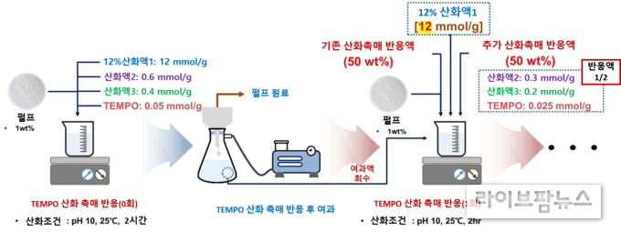 국립산림과학원은 산화 반응 이후 남은 용액을 회수해 다시 사용하는 방식으로 공정을 개선했다. 반응 후 고형분과 액체를 분리해 산화여액을 확보하고, 이를 신규 산화제와 혼합해 공정에 재투입하는 구조다. 이를 통해 산화제를 최대 3~5회까지 재사용할 수 있도록 했으며, 화학물질 사용량과 폐수 발생을 동시에 줄였다.