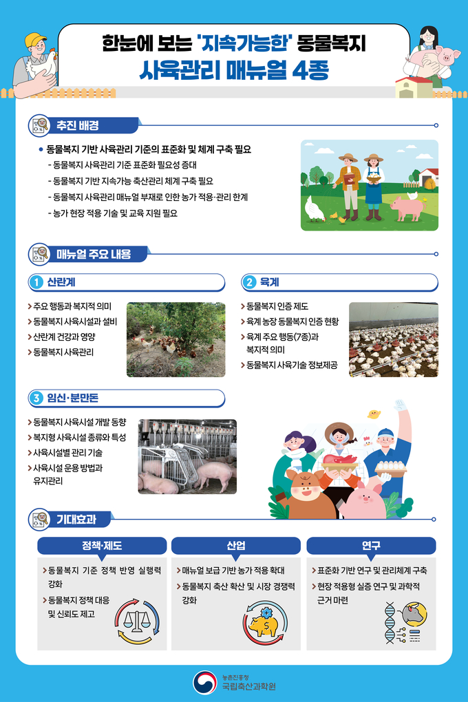 이번 지침서는 국립축산과학원이 학계·산업계와 협력해 축적한 연구 성과와 현장 기술을 바탕으로 제작됐다. 동물복지 축산농장 인증 기준을 현장에서 이해하고 적용할 수 있도록 구체적인 관리 방법과 시설 기준을 중심으로 정리한 것이 특징이다.